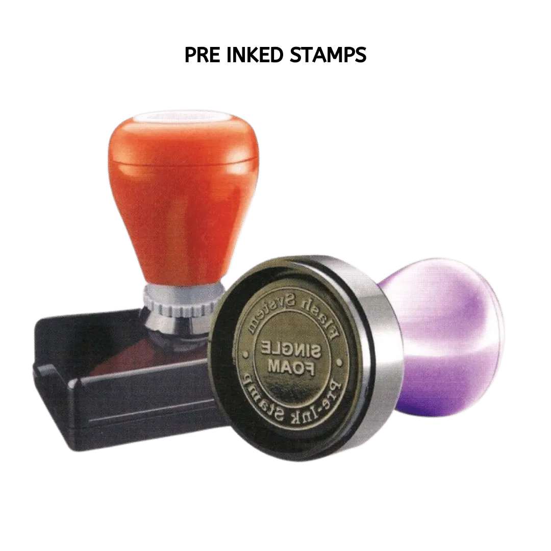 Pre-inked Stamps come without pads they come pre-inked for your convenience making their use hassle free, leaving your fingers clean and ink-less. Select the required stamp pad size, shape, ink colour and quantity to customize your needs.